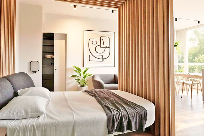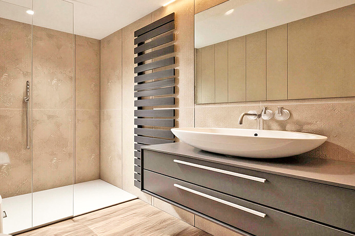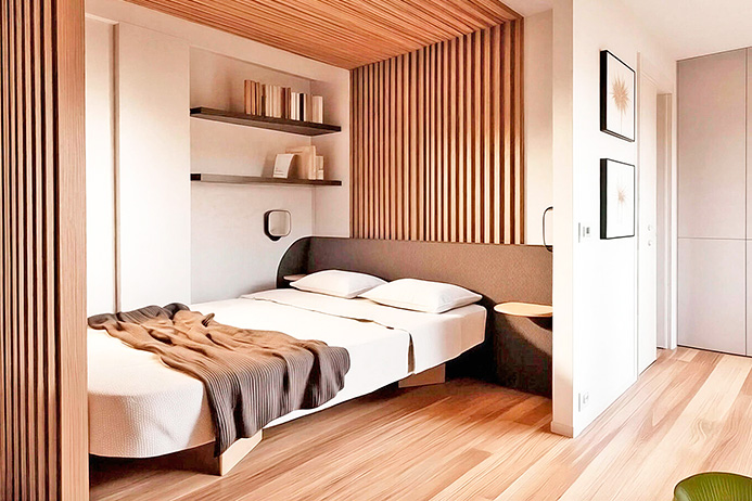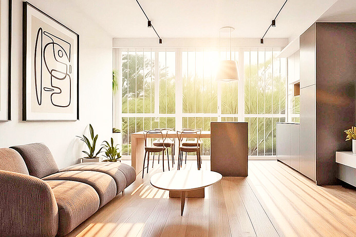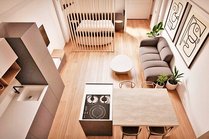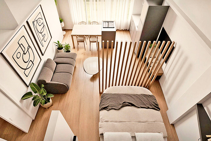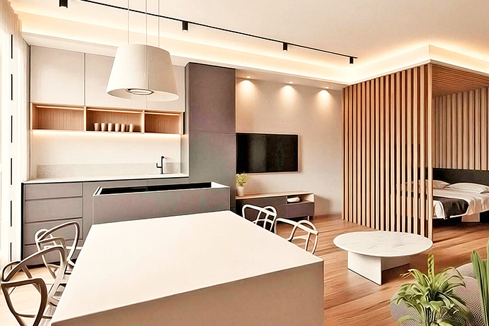 Internally the apartment will consist of a large entrance hall with laundry area, walk-in closet, bathroom and a single large open-plan area with an island kitchen and a large, bright panoramic window.
