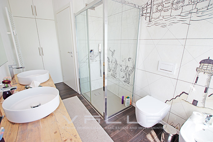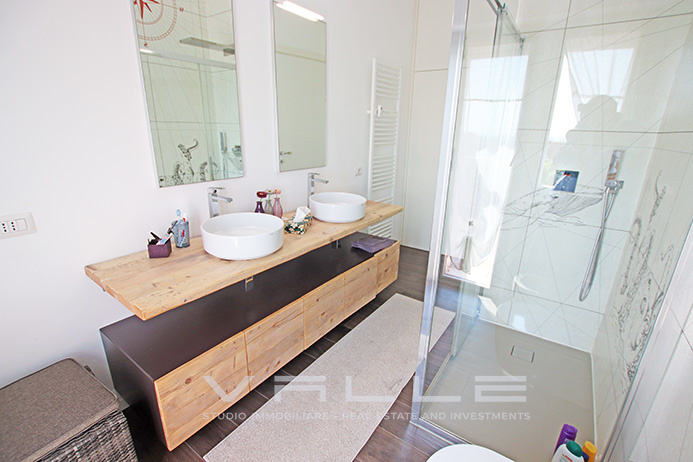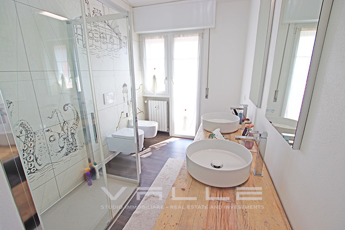 The property has recently been completely renovated and is in perfect condition, featuring external insulation, double-glazed PVC windows, air conditioning, metered central heating, modern wood-effect stoneware flooring, bathroom with wall-mounted fixtures, double sink and a large walk-in shower.
