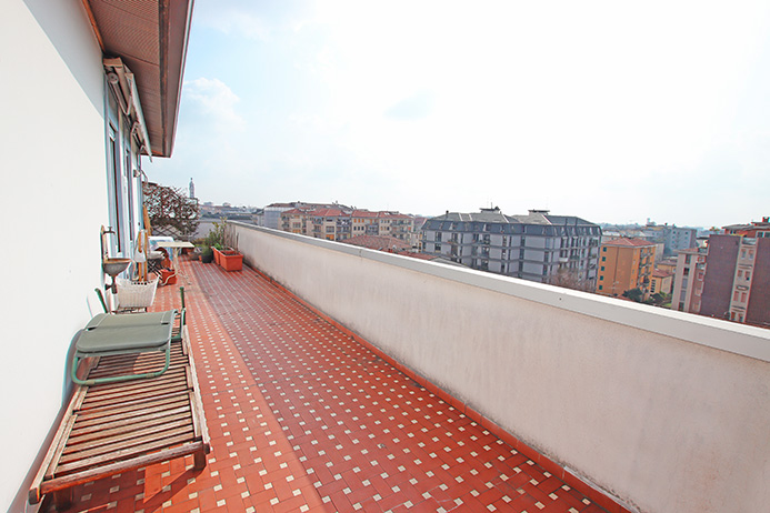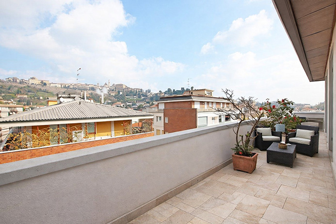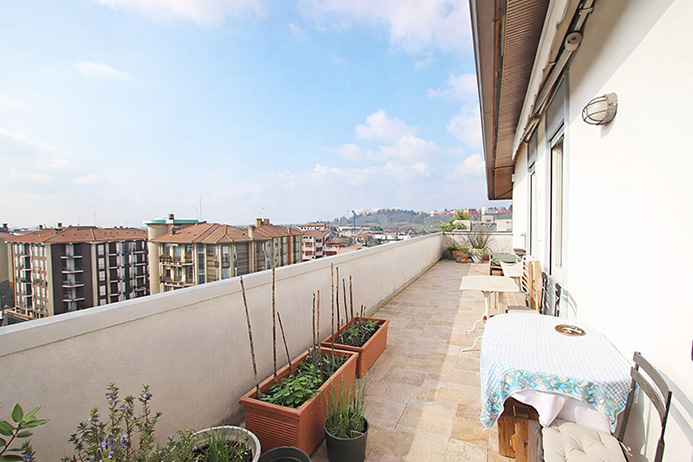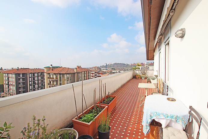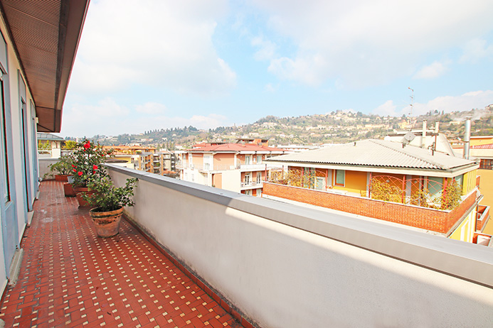 La proprietà è esposta su 3 lati e gode di una vista della città, da città alta, la terrazza lambisce completamente i lati dell’immobile e tutti gli ambienti godono di accesso ad essa.