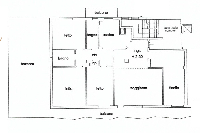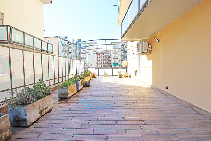 Internamente l’appartamento è composto da ampio ingresso, ampio salone con accesso al terrazzo, cucina abitabile con dispensa ed accesso al balcone di servizio, 4 camere da letto matrimoniali di cui 3 con accesso al terrazzo, 2 bagni finestrati, ripostiglio e grande terrazza di mq 100.