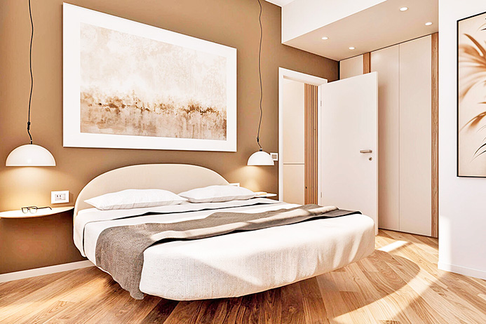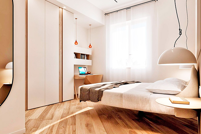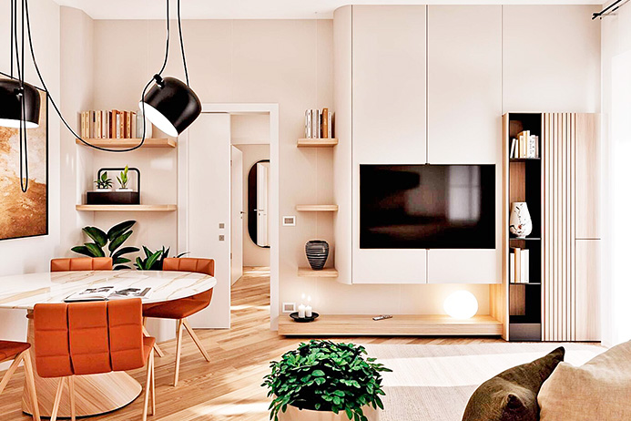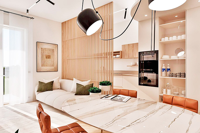 Внутри квартира будет состоять из большой гостиной с кухонным уголком и выходом на балкон, прихожей с прачечной, спальни с двуспальной кроватью и большой ванной комнаты с окном.