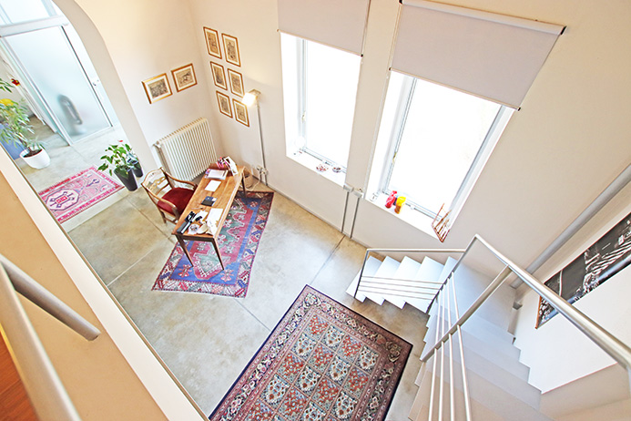 该物业包括一个可从一楼独立出入的入口(仅供两户人家共用楼梯),一个宽敞的开放式厨房,一个面积约80平方米的宽敞客厅(拥有双层挑高拱形天花板和巨大的落地窗,可通往景观露台),以及一个可用作书房/卧室的空间(配备浴室和步入式衣帽间),该空间内设楼梯通往夹层。夹层设有一间卧室(带浴室,与下方的书房相连)和一个可俯瞰厨房的大型衣帽间(可通过增设第二个内设楼梯,实现两个夹层的独立出入)。