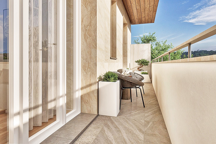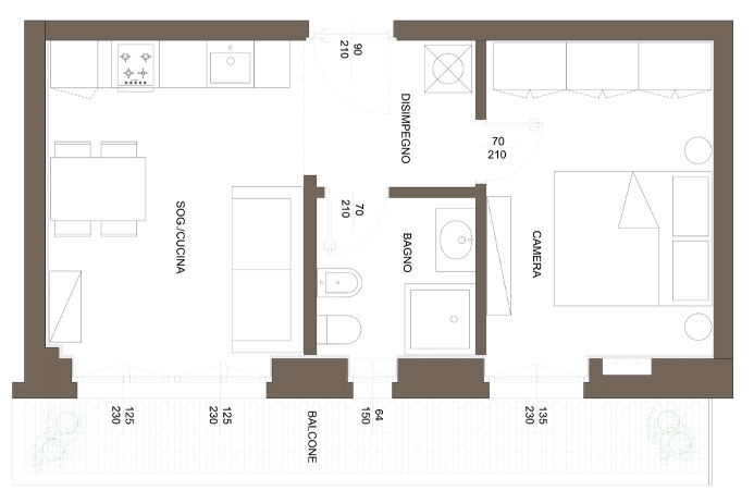 公寓内部设有带洗衣区的大走廊、带开放式厨房并可通往阳台的客厅、带窗户的浴室以及可通往阳台的大主卧室。