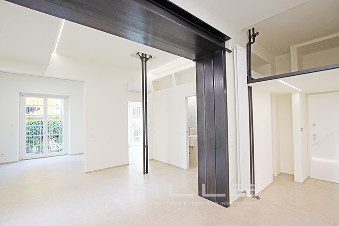 公寓已全面翻新,配备计量中央供暖系统、带热泵的空调、电动百叶窗、防盗报警系统、现代大尺寸石材地板,以及裸露铁梁、格状天花板和带漫射照明的吊顶等设计细节。