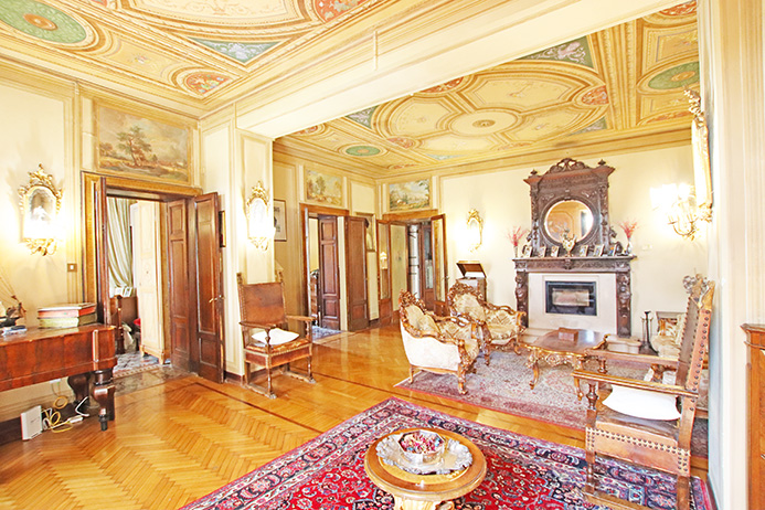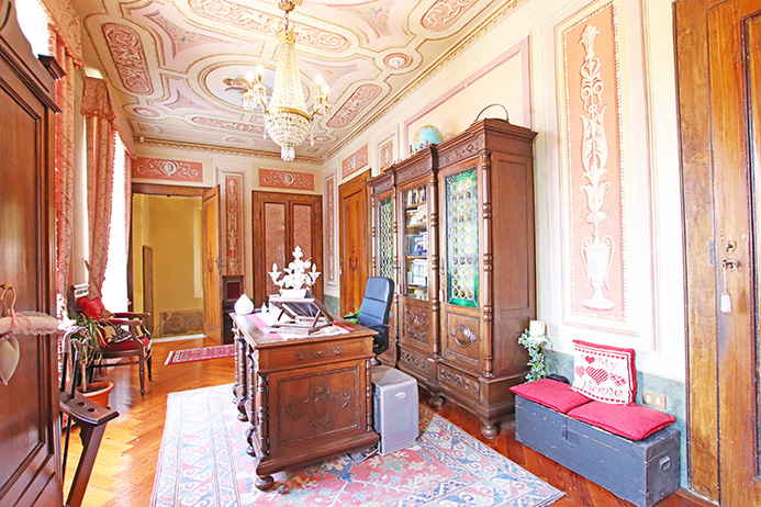 别墅内部设有一个宽敞的入口,主楼梯通往建筑的三层,一个绘有壁画的大型阳台,可俯瞰主庭院和公园,此外还有两个连接现有三栋房屋的内部楼梯。
